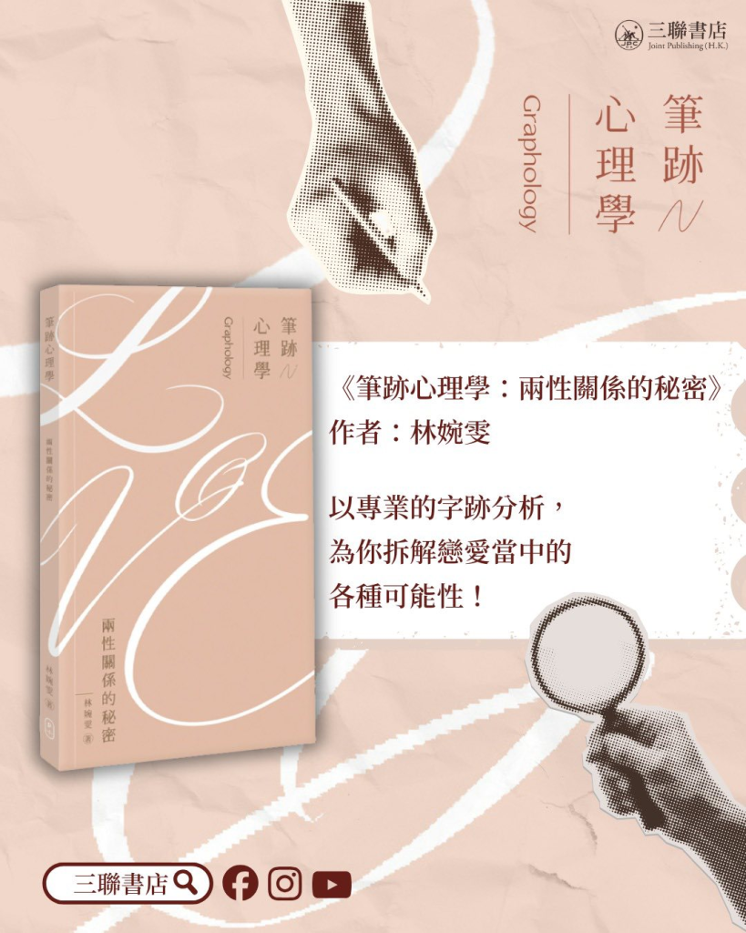 筆跡分析是一個認識自己的工具,能夠窺見我們各方位發展的傾向,包括性格、興趣和品味、社交行為模式,能夠應用在兩性關係、職場、甚至職涯規劃上! 香港電台日前邀請《筆跡心理分析之職涯規劃篇:你找到合適的工作嗎?》其中兩位作者林婉雯Maria和何潤儀到香江暖流節目《高手過Chill》,探討筆跡分析如何應用到生活上不同層面上。 《筆跡心理分析之職涯規劃篇:你找到合適的工作嗎?》 透過找出從事不同職業人士的筆跡的共通之處,幫助我們認識自己的潛力,找一份合適的工作。 《筆跡心理分析之職涯規劃篇:你找到合適的工作嗎?》林婉雯、楊康婷、何潤儀、吳曼華 著頁數:272頁定價:$118元按此線上購買