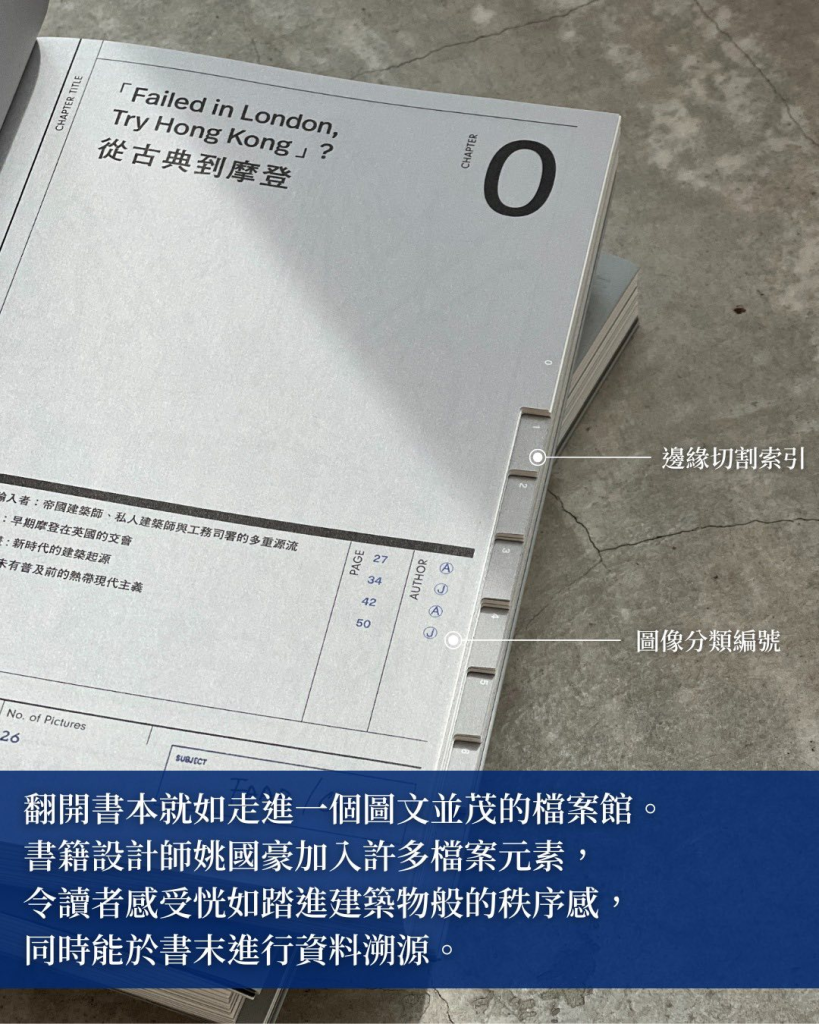 書籍以「資料夾」形式設計,翻開書本就如走進一個圖文並茂的檔案館。書籍設計師姚國豪加入許多檔案元素,其中以邊緣切割方式呈現的索引設計,既作為章節分類指引,又營造出有如水泥階梯般的視覺效果,並設圖像分類編號,如P為相片、S為草圖等,進一步協助整理研究資料,令讀者感受恍如踏進建築物般的秩序感,同時能於書末進行資料溯源。