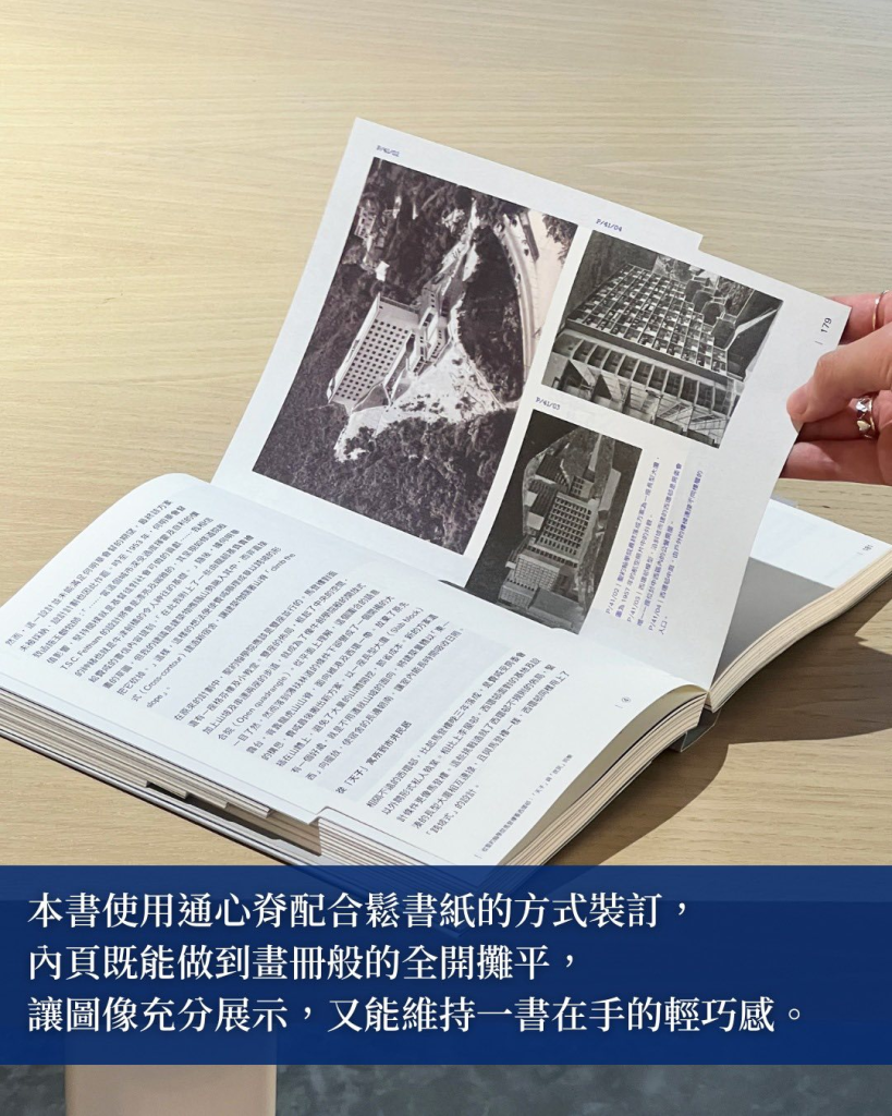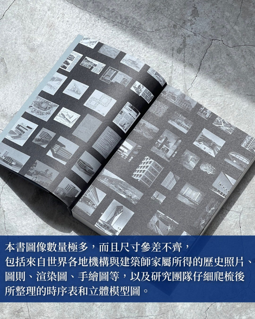 本書圖像數量極多,而且尺寸參差不齊,包括來自世界各地機構與建築師家屬所得的歷史照片、圖則、渲染圖、手繪圖等,以及研究團隊仔細爬梳後所整理的時序表和立體模型圖——封面以書中各類相片的幾何比例為元素,巧妙融合壓凹工藝,呼應本書以圖像追溯歷史的想法,打造出層次分明的視覺語言。