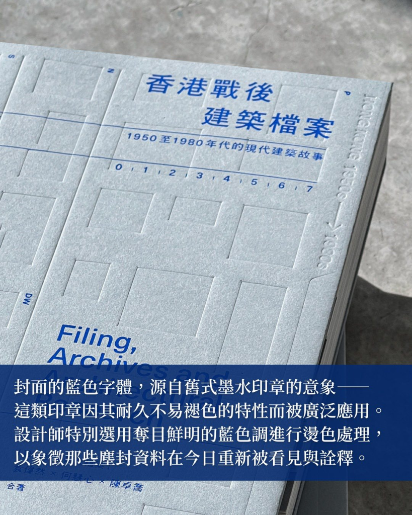 戰後香港社會面對人口暴增、重建需求,採取世界風行的現代主義設計,追求簡潔,強調功能性和實用性。由本地工匠實踐舶來的建築理念,選用本地的材料,並因應氣候及社會環境,逐漸發展成屬於香港的融合多重文化與思想影響的建築體系。 《香港戰後建築檔案:1950至1980年代的現代建築故事》探討1950至1980年代香港建築發展的不同階段,以建築故事作為切入點,串連香港與亞洲以至世界其他地區的建築脈絡,回應「香港建築缺乏特色」的迷思,同時在無盡長河中找到「香港建築」的位置。 書籍以「資料夾」形式設計,翻開書本就如走進一個圖文並茂的檔案館。設計師巧妙加入許多精緻的檔案元素,其中以邊緣切割方式呈現的索引設計,既能作為章節分類指引,又能營造出有如水泥階梯般的視覺效果,令讀者感受恍如踏進建築物般的秩序感。 本書使用通心脊配合鬆書紙的方式裝訂,內頁既能做到畫冊般的全開攤平,讓圖像充分展示,又能維持一書在手的輕巧感。 書中設圖像分類編號,如P為相片、S為草圖等,進一步協助整理研究資料,建立鮮明的視覺識別,同時能讓讀者於書末進行資料溯源。 本書圖像數量極多,而且尺寸參差不齊,包括來自世界各地機構與建築師家屬所得的歷史照片、圖則、渲染圖、手繪圖等,以及研究團隊仔細爬梳後所整理的時序表和立體模型圖——但這樣反而成為一種靈感:封面設計以書中各類相片的幾何比例為元素,巧妙融合壓凹工藝,以呼應本書以圖像追溯歷史的想法,打造出層次分明的視覺語言。 封面所採用的藍色字體,靈感源自舊式墨水印章的意象——這類印章常見於檔案文件,使用鐵膽墨或藍黑墨水,因其耐久不易褪色的特性而被廣泛應用。希望藉由這種色彩記憶,營造出富有歷史感的設計語言。 設計師特別選用奪目鮮明的藍色調進行燙色處理,以象徵那些塵封資料在今日重新被看見與詮釋。書封文字因燙色加工而產生自然斑駁痕跡,亦呼應墨水印章每次蓋印時略有差異的質感,讓封面設計更具層次與生命力。 翻開這本「建築資料夾」,豐富的圖片和扎實的內容將帶我們回到1950到1980年代的香港,它不僅記錄了歷史,也讓我們更具體地理解了香港建築的特色和獨特價值。 《香港戰後建築檔案:1950至1980年代的現代建築故事》作者:袁偉然、何慧心、陳卓喬頁數:352頁尺寸:153 × 220 mm定價:$248按此線上購買