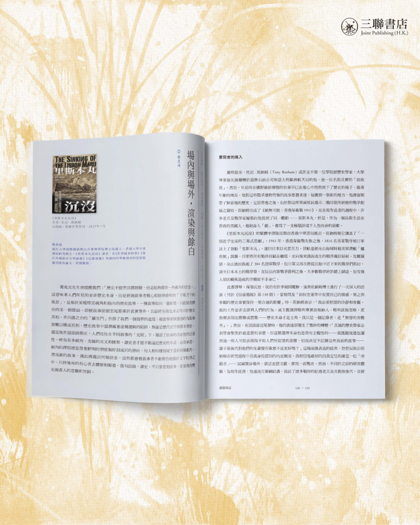 今期《讀書雜誌》,《里斯本丸沉沒》譯者楊惠迪帶領讀者從一部史著的成書背後,探討樹立客觀與主觀之分界所帶來的挑戰。在創作開端,《里斯本丸沉沒》作者托尼·班納姆將自己定位為一位「旁觀者」,然而隨着一次次與戰時駐港老兵及其親族後代的交談,托尼·班納姆最終決定不於書中記錄史事中的負面故事,讓《里斯本丸沉沒》成為獻給戰俘們的鎮魂曲,以及留給遺族的戰爭記憶。
