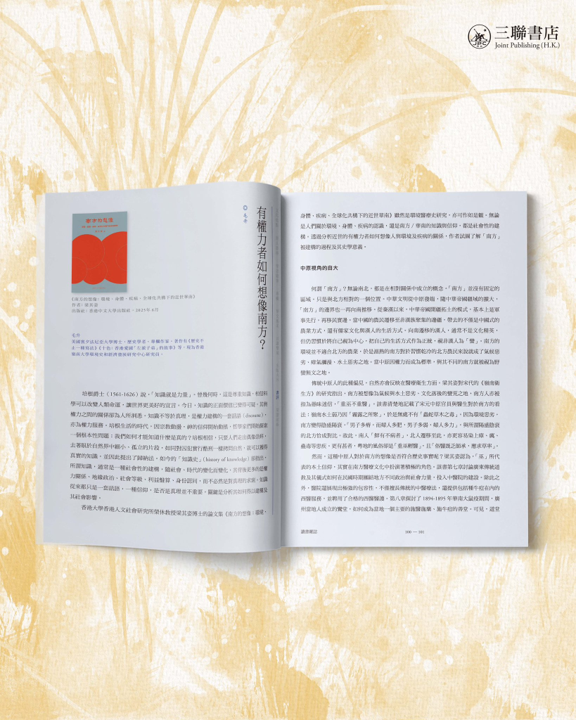 知識不一定是真理?「南方被想像為氣候與水土惡劣、文化落後的蠻荒之地……」歷史上,中華文明從中原發端,「南方」卻遠離政治中心。這使傳統中原人、以至西殖民者,都對南方存有負面的刻板想像,亦見當時的「知識」不必然是對真理的求索,而是建構社會權力的一種工具。