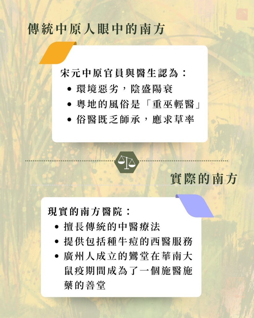 香港大學教授梁其姿著作《南方的想像:環境、身體、疾病、全球化共構下的近世華南》從環境、疾病與全球化交織的視角,揭示了近世華南社會背後的權力想像。毛升教授提及,外界對南方的想像往往與史實不符,這不多不少是社會權力建構失衡的結果。例如,宋元中原官員與醫生認為粵地的風俗是「重巫輕醫」。實際上,南方醫院不僅擅長傳統的中醫療法,還提供包括種牛痘在內的西醫服務。1894-1895 年華南大鼠疫期間,廣州人成立的鸞堂更成為了一個施醫施藥、施牛痘的善堂。