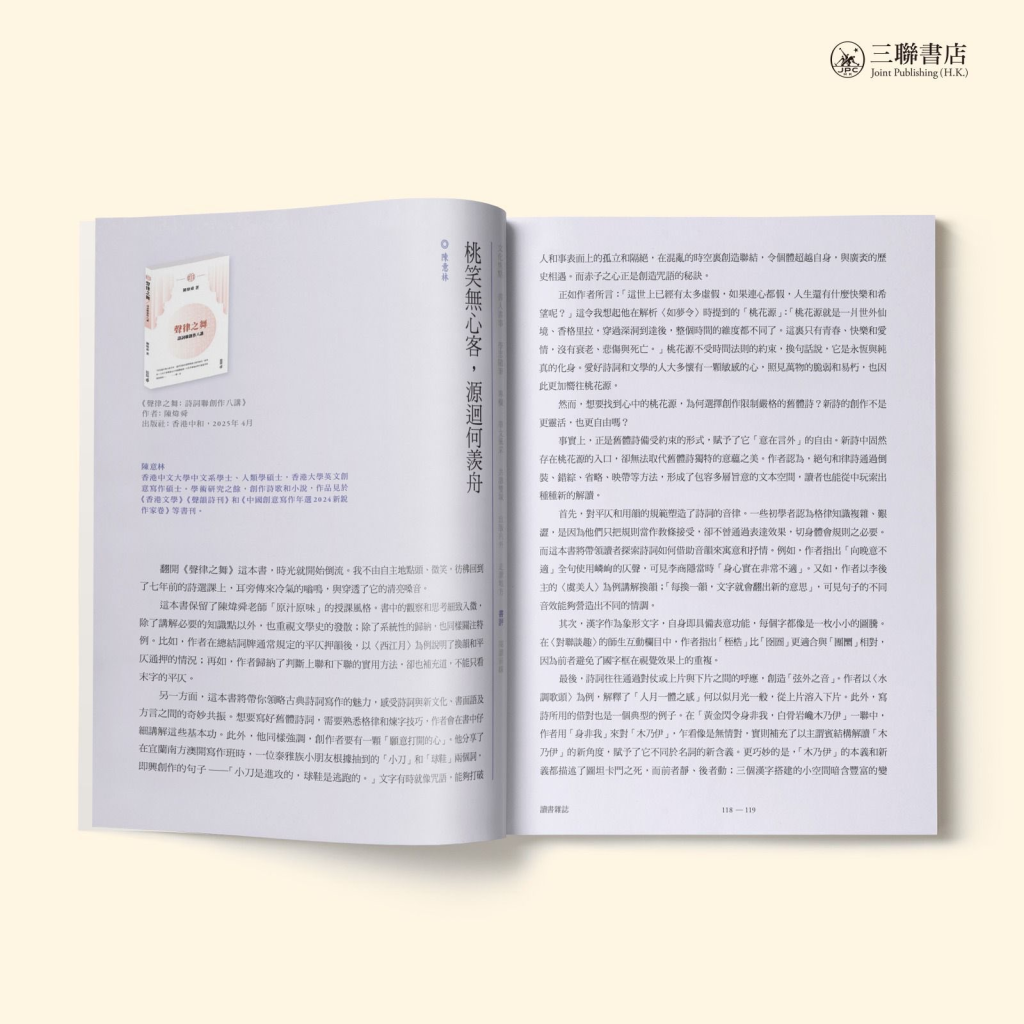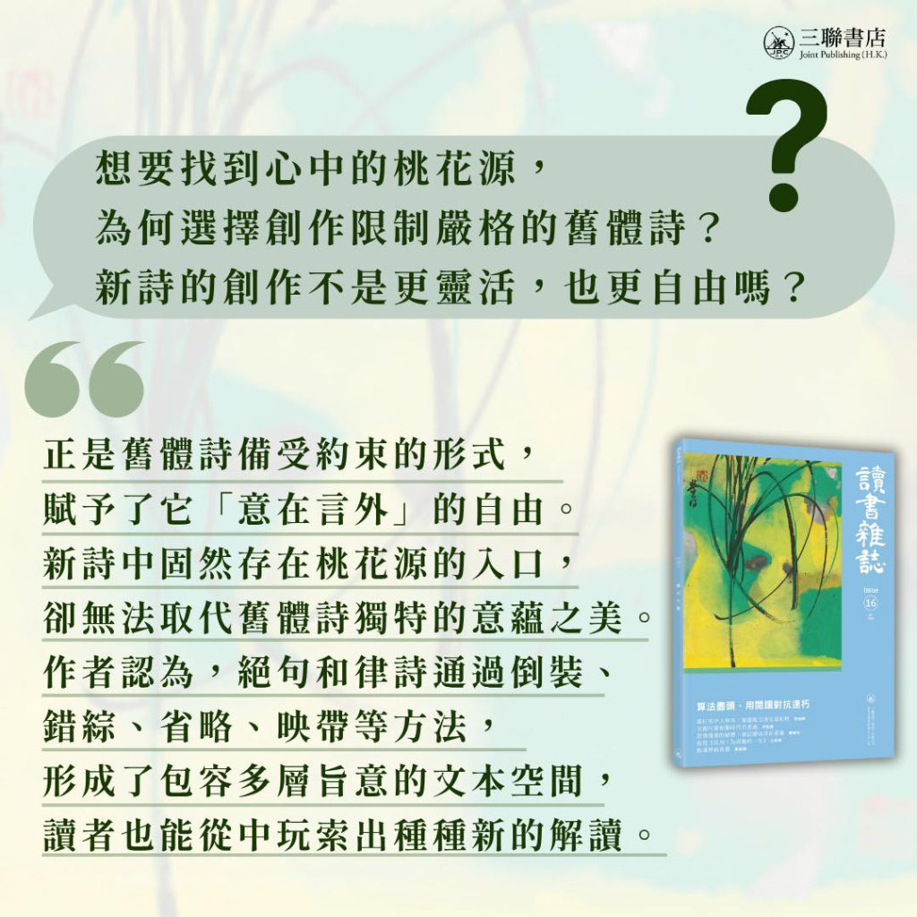 對陳意林來說,桃花源的入口,自然是舊體及新詩所共有的。然而他強調,陳煒舜先生於專書《聲律之舞:詩詞聯創作八講》裏所講求的形式上的約束——意即舊體詩意藴之美,則更接近桃源鄉入口處狹細的甬道,曲徑通幽,「通過倒裝、錯綜、省略、映帶等方法,形成了包容多層旨意的文本空間,讀者也能從中玩索出種種新的解讀。」