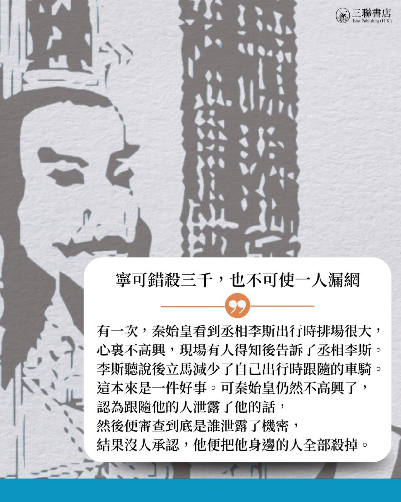 有一次,秦始皇看到丞相李斯出行時排場很大,心裏不高興,現場有人得知後告訴了丞相李斯。李斯聽說後立馬減少了自己出行時跟隨的車騎。這本來是一件好事。可秦始皇仍然不高興了,認為跟隨他的人泄露了他的話,然後便審查到底是誰泄露了機密,結果沒人承認,他便把他身邊的人全部殺掉。