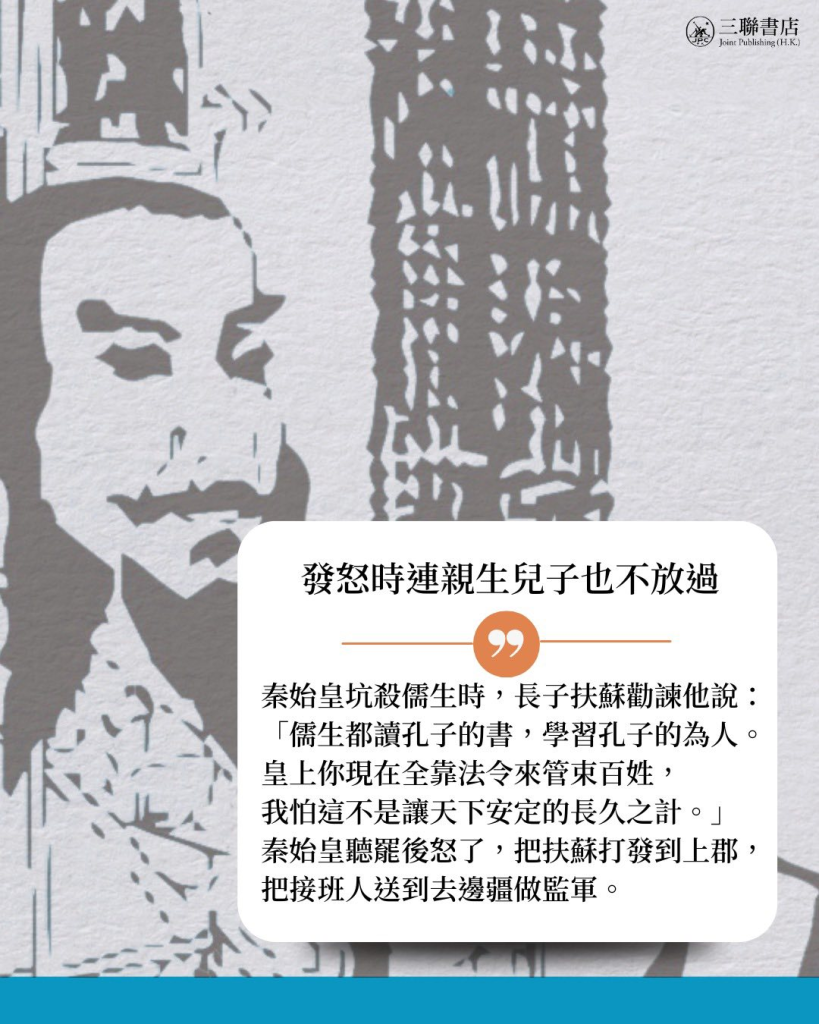秦始皇坑殺儒生時,長子扶蘇勸諫他說:「儒生都讀孔子的書,學習孔子的為人。皇上你現在全靠法令來管束百姓,我怕這不是讓天下安定的長久之計。」秦始皇聽罷後怒了,把扶蘇打發到上郡,把接班人送到去邊疆做監軍。