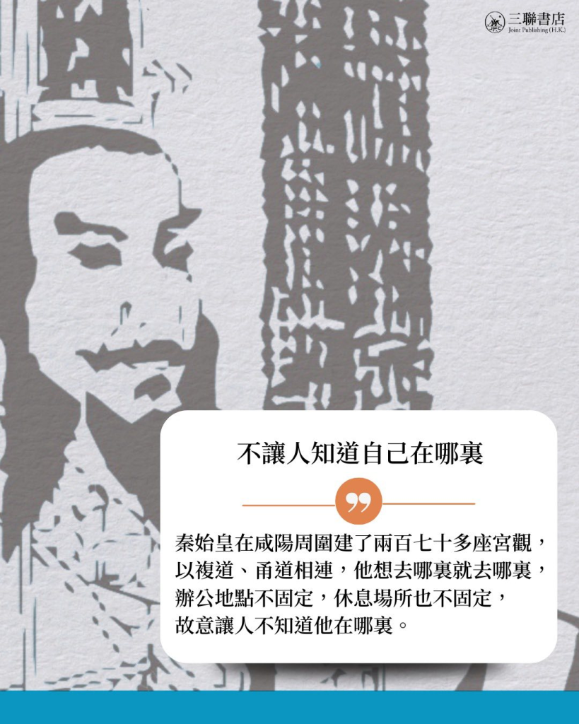 秦始皇在咸陽周圍建了兩百七十多座宮觀,以複道、甬道相連,他想去哪裏就去哪裏,辦公地點不固定,休息場所也不固定,故意讓人不知道他在哪裏。