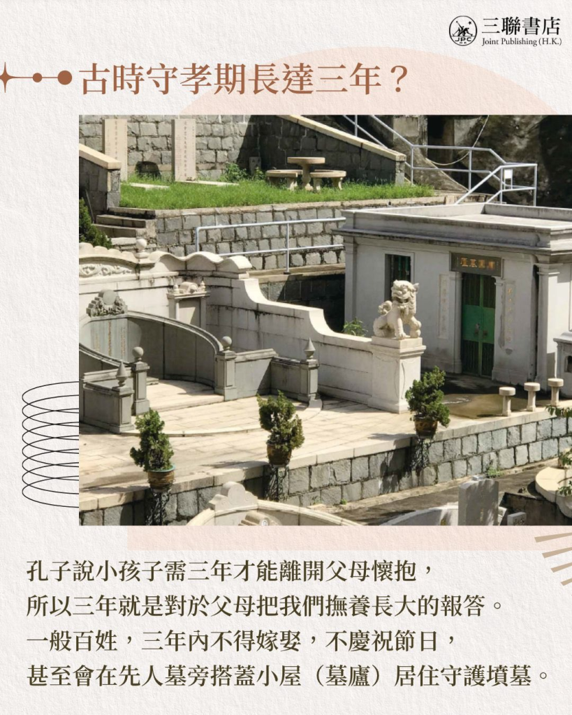 《論語.陽貨》篇說:「子生三年,然後免於父母之懷。夫三年之喪,天下之通喪也。」孔子說小孩子需三年才能單獨走路,斷奶,離開父母懷抱,所以三年就是對於父母把我們撫養長大的報答。從前當官的碰到父母過世,如果不馬上告假還郷就會被彈劾,嚴重者可能永不錄用。而一般百姓,三年內不得嫁娶,不慶祝節日,不剪頭髮,不可去歡樂場所,不進入別人的房屋及寺廟,不參與任何紅白事,甚至還會結廬守葬,在先人墓旁搭蓋小屋(墓廬)居住守護墳墓。今天守孝期由三年縮短到百日,守孝時不能參與親友的紅白二事和做禮,但可以後補。