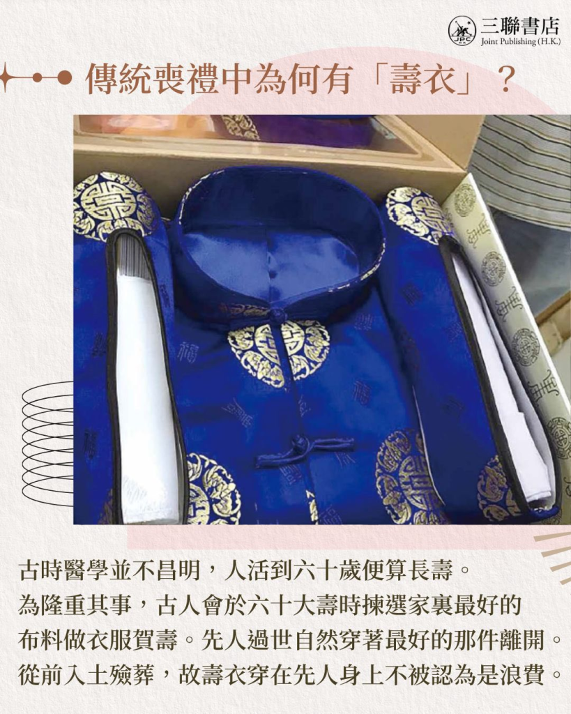 古時醫學並不昌明,疾病難癒,生命脆弱,人活到六十歲便算長壽,能走完「一甲子」即六十年循環。為隆重其事,古人會於六十大壽時揀選家裏最好的布料做衣服賀壽。故往後先人過世,自然穿著最好的那件離開。從前入土殮葬,陪葬衣物不像今天火葬般付諸一炬,壽衣穿在先人身上不被認為是浪費。後來人愈來愈長壽,亦會於在生時為自己預做壽衣,認為能夠添壽及為兒孫增福。