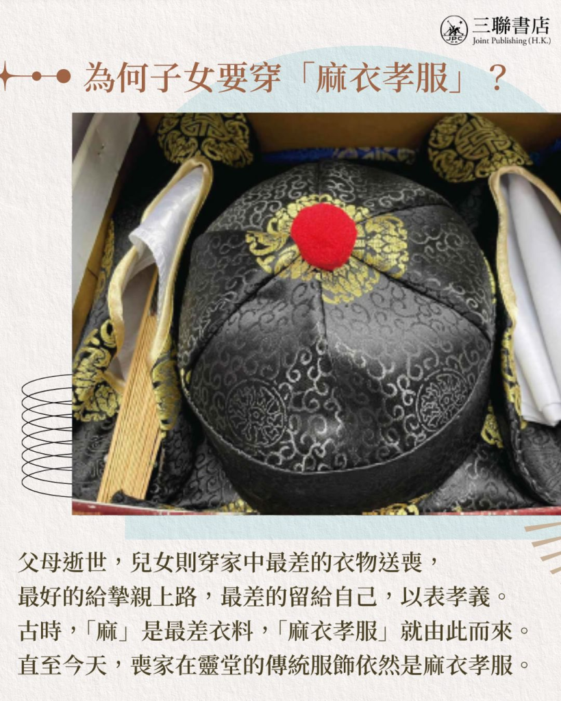 父母逝世,兒女則穿家中最差的衣物送喪,最好的給摯親上路,而最差的留給自己,以表孝義。古時,「麻」是最差衣料,「麻衣孝服」就由此而來。傳統壽衣按照古時祭祀規格,男士的包括內衣、內褲、面衫、面褲、長衫、馬褂,共六件;女士的,馬褂變成裙丶褂,共七件,直至今天,喪家在靈堂的傳統服飾依舊以麻衣孝服為主,包括粗糙的扣服加上披麻,而「披麻戴孝」的「戴孝」就是男士胸前戴黑紗及女士戴頭花。