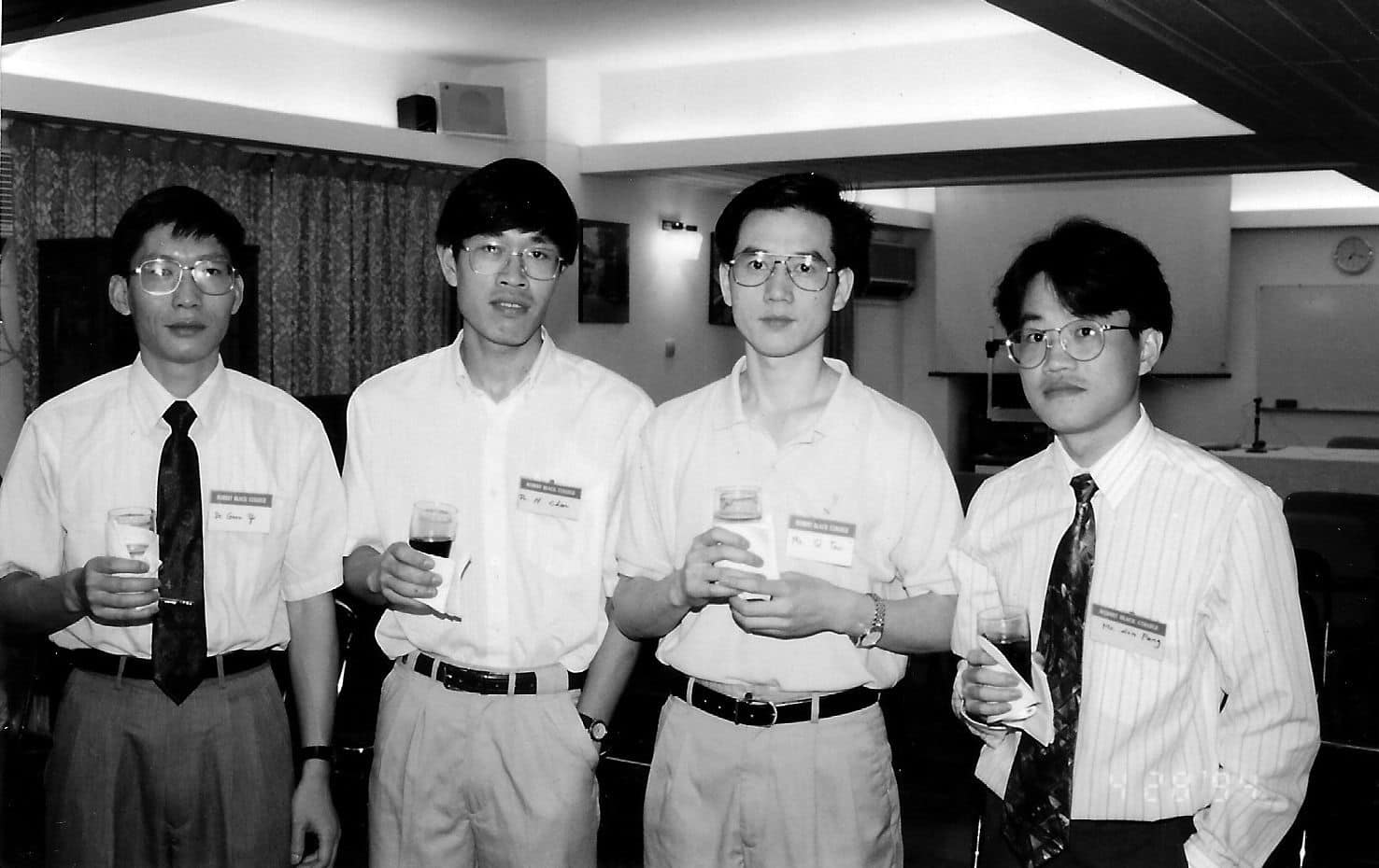 1994年4月28日,管軼(左一)、陳鴻霖(左二)與其他到港大學習的汕頭大學學員在港大柏立基學院參加研討會合影。(陳鴻霖提供)