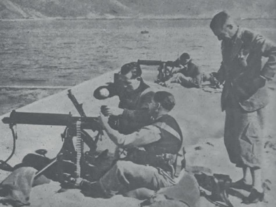 香港防衛軍進行機槍訓練(當時刊物)。守軍的第2、3、5、6連均為機槍連,但只有第3連以維克斯重機槍為主要武器。