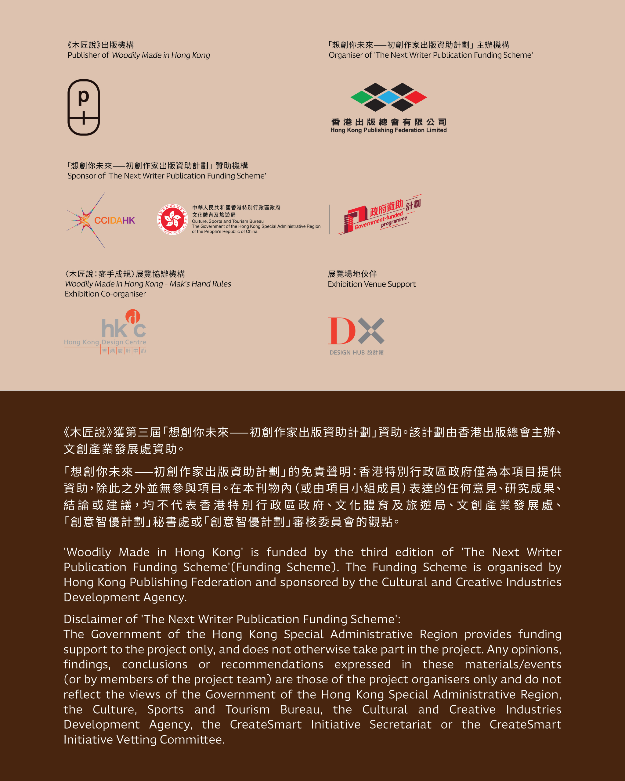 《木匠說》獲第三屆「想創你未來—初創作家出版資助計劃」資助。該計劃由香港出版總會主辦、文創產業發展處資助。
