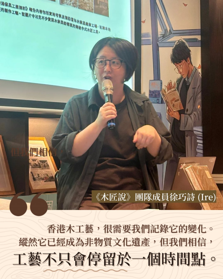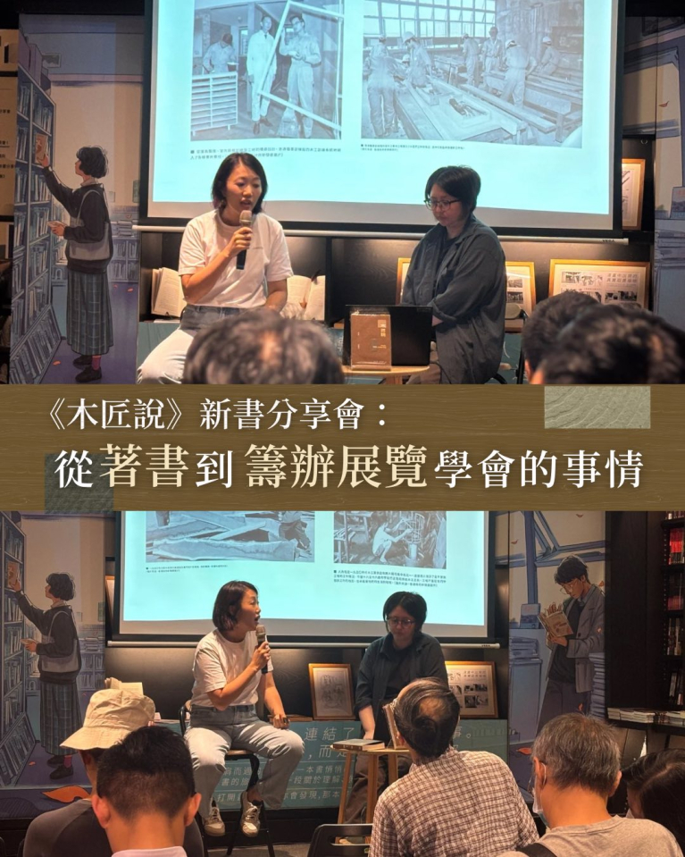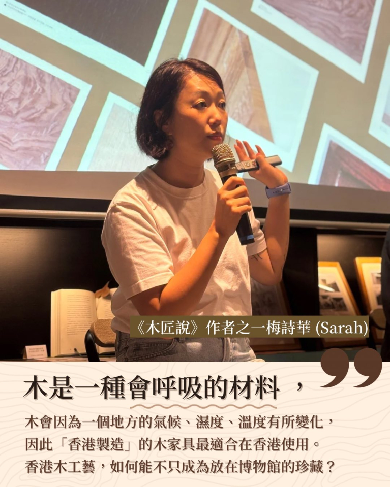 10月18日,《木匠說》作者之一梅詩華 (Sarah) 和出版團隊成員徐巧詩 (Ire) 在誠品銅鑼灣店的分享會裡回顧《木匠說》從著書到籌辦展覽的過程。對於建築師和設計師,木是一種怎樣的材料?Sarah和Ire一致認為:「木是一種會呼吸的材料 」。Sarah提及,木會因為一個地方的氣候、濕度、溫度而有所變化,木家具一旦出口到其他地方,榫卯不免會有鬆脫的情況。因此,「香港製造」的木家具,最適合在香港使用。