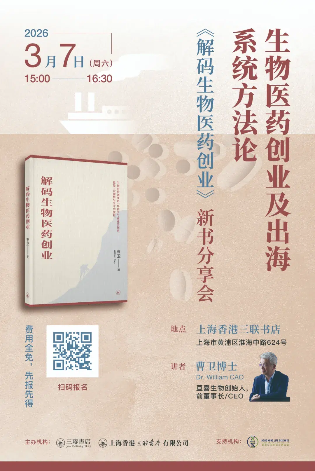 2026年3月7日,《解碼生物醫藥創業》一書將在上海舉行內地首場新書分享會。我們榮幸邀請到本書作者 曹衛博士(Dr. William CAO),以其橫跨科研、創業與投資的獨特經歷,為我們系統拆解生物醫藥創業及出海的系統方法論。