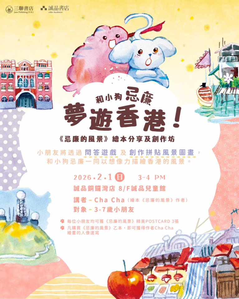 2月1日下午,忌廉的新主人(繪本《忌廉的風景》作者)Cha Cha將來到誠品銅鑼灣店,和小朋友們分享小狗忌廉的誕生過程,再一起以想像力描繪香港的風景。透過問答遊戲及創作拼貼風景圖畫,小朋友將和忌廉一同重新想像香港,展開夢幻的旅程。