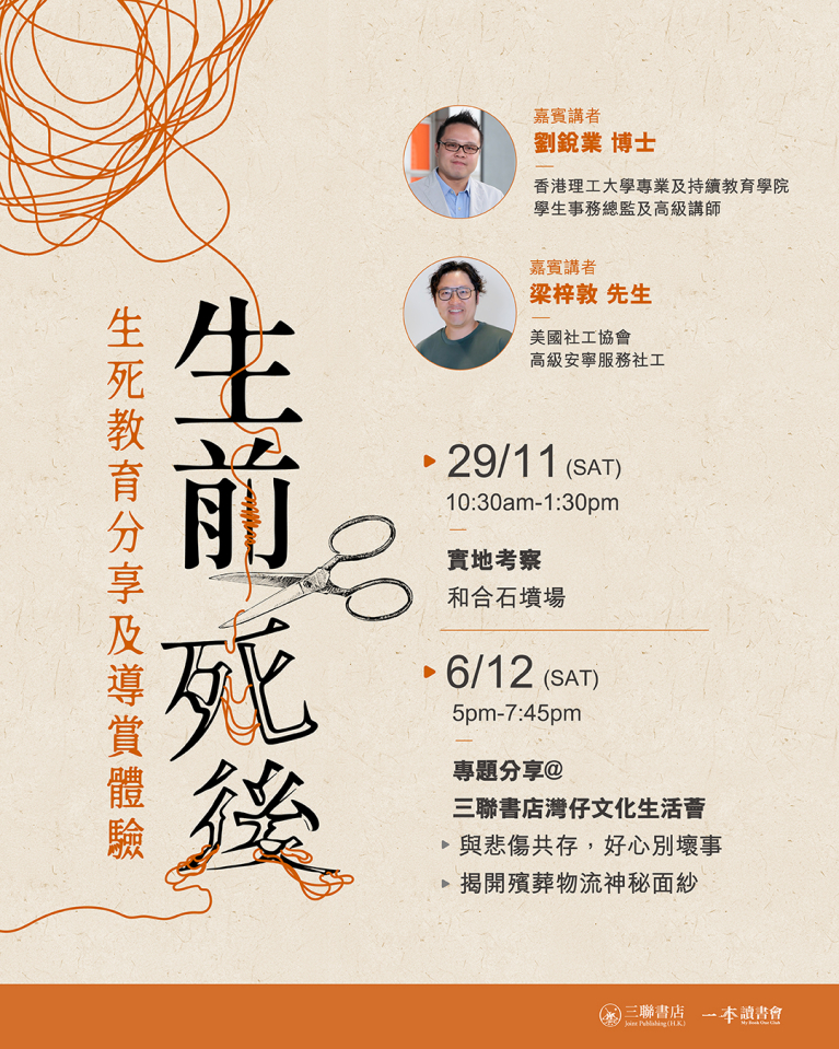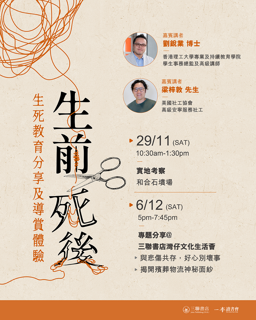 當我們面對生死議題時,往往充滿恐懼和迷思。為提供實用的身後事知識,並推廣正向的死亡觀,繼今年7月出版的《生前死後:解開身後事的迷思》,我們今次邀請到其中兩位作者劉銳業博士和梁梓敦先生,以和合石墳場實地考察及「與悲傷共存,好心別壞事」、「揭開殯葬物流神秘面紗」兩場書店分享,和大家生死有約,破除對死亡的恐懼。