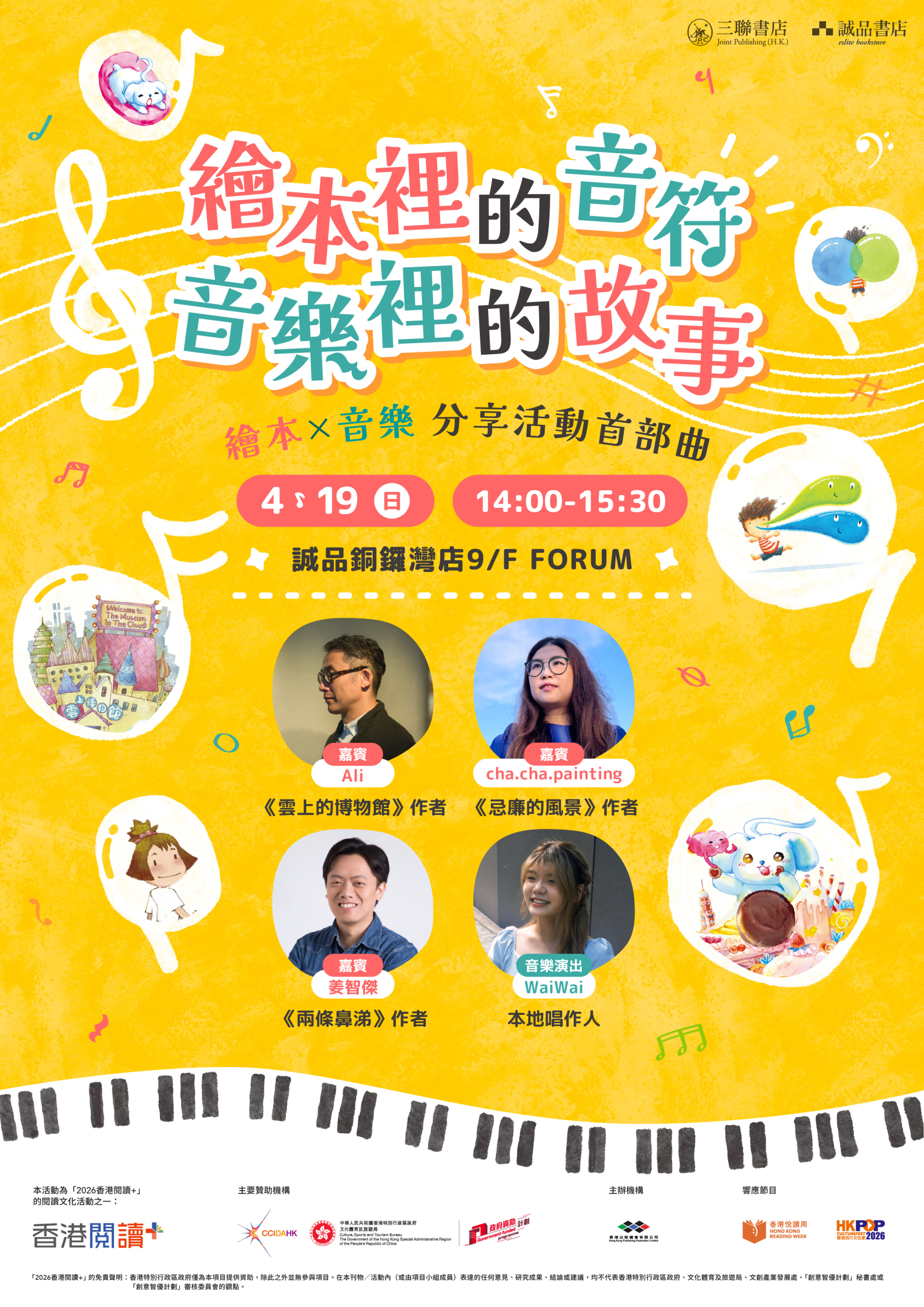 今次活動除了有《雲上的博物館》、《忌廉的風景》及《兩條鼻涕》的作者們和大家分享創作故事的點滴,本地唱作人Waiwai更將為大家即場演出,以音樂串連並重新演釋這些繪本故事。