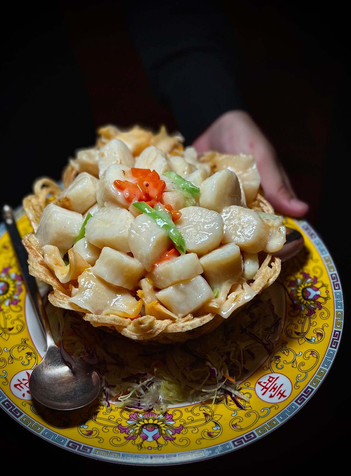 晚宴席間,由「燒味王」陳永翰師傅介紹第一道菜——金玉滿堂大紅乳豬全體。乳豬堪稱眾多燒味中比較複雜的一種,對切割、醃製、燒烤三個步驟的精確把握缺一不可,盡展燒味師傅的巧技。
