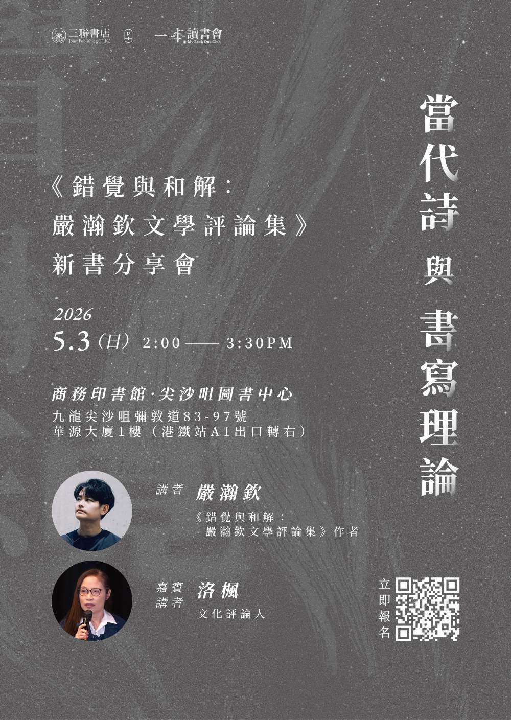 香港詩人嚴瀚欽攜最新文學評論集《錯覺與和解》,與著名學者洛楓教授展開一場深度的詩學對話。該書分五輯,涵蓋港台近年詩作評論、詩人專論、隨筆詩話等內容,兼具深度與溫度。