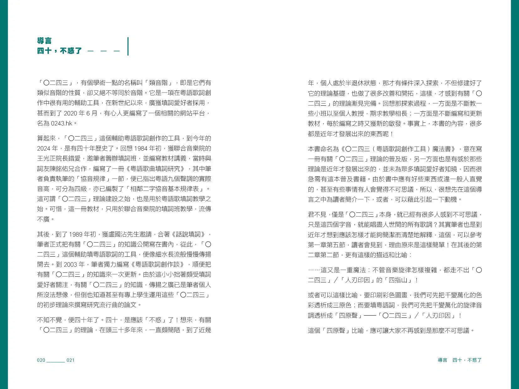在填詞人的圈子之中,早流傳一種「○二四三法」——一項在粵語歌詞創作中很有用、像魔法般神奇的輔助工具。「○二四三法」可讓詞人先以這四個數字來填歌調,而不須填上有意思的文字,這樣便能很輕鬆地去體會如何填才「啱音」。當然,「○二四三法」的用途不止一個,還可用來研究填詞上的協音問題等等。可是,這項廣獲填詞愛好者採用的工具,在本書面世前尚未形成完善的理論。