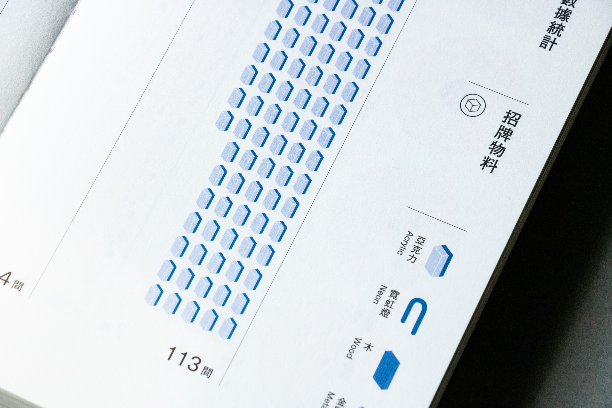 此外,本書亦將大量招牌數據視覺化(Data Visualization),將包括物料、種類、字型、顏色、圖案、位置等變項作細緻的分類量化,並以圖表方式呈現。這些數據不僅讓讀者對各區招牌的分布情況一目了然,更可作跨區、跨行業、跨類型的比較。無論是想了解某區最常用的招牌物料、哪類字型最受歡迎,還是不同行業的招牌設計差異,都可以透過這些數據圖表快速掌握相關資訊,從而深化對東京招牌文化的理解。