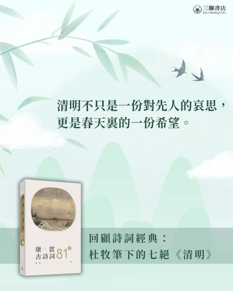「清明時節雨紛紛,路上行人欲斷魂。借問酒家何處有?牧童遙指杏花村。」杜牧筆下的七言絕詩《清明》,幾乎成為了清明節的代名詞。為什麼在「雨紛紛」的「清明時節」,「路上行人」會「斷魂」呢?面對美好的春光,「斷魂」是不是也有些「銷魂」的意味呢?由康震所著的《康震古詩詞81課》,將清明節的歷史,以至《清明》描繪的意境娓娓道來: 「清明是中國傳統二十四節氣之一。俗話說『清明前後,種瓜點豆』,意思是清明一到,氣溫慢慢升高,是春耕春種的大好時節。清明不僅是物候的節氣,也是一個傳統節日,節日往往跟農時、勞作、祭祀緊密地結合在一起。清明時節,人們紛紛走出家門踏青春祭,拜祭先祖祈求家族平安,同時舉行拔河、蕩秋千、放風箏、試新茶等一系列活動。 與清明密切相關的寒食節,更添一層追思的意味。據說晉文公以冷食表達對介子推的敬意,後來進一步延伸至祭奠先人。在唐代,寒食節和清明節是兩個既有區別又有聯繫的節日,慎終追遠、祭掃祖先是它們的共同內涵。所以清明時節既要開展一些與春季相關的活動,感受『一年之計在於春』的朝氣,同時又要慎終追遠,掃墓祭祖。 清明祭掃先祖,心情不免悵惘低沉,恰逢春雨紛紛,更是蕩漾起了無限情絲。此時此刻,都特別需要一樣東西來舒緩內心的情緒,這就是酒。路上的行人想要喝點酒,不僅是借酒澆愁,也可喝酒助興,欣賞明媚的春光。最後『牧童遙指杏花村』,是全詩最妙的一句。『牧童』和『杏花村』可能是實指,也可能是一種意象,象徵着一種鄉村的生活情趣。 《清明》這首詩雖然很短,卻營造了特別濃郁的清明氛圍:雨紛紛、欲斷魂、牧童、酒家、杏花村,這就是清明時節最典型的一組意象。因此,只要到了清明,我們就會不由自主地想到這首詩,眼前甚至會立刻浮現出這首詩所描繪的畫面。至於所寫的路上行人是誰,酒家賣的是什麼酒,杏花村究竟在什麼地方,反而變得不那麼重要了。」 《清明》傳誦至今,不僅提醒着我們記憶在傳承,更預兆着生命的延續。清明不只是一份對先人的哀思,更是春天裏的一份希望。 《康震古詩詞81課》著名古典詩詞專家康震教授精講81首國民必讀古詩詞,小到字句意象、文史典故,大到詩人身世、人生心境等多維度解讀。作者:康震頁數:432頁開度:135mm × 210mm定價:港幣188元按此線上購買